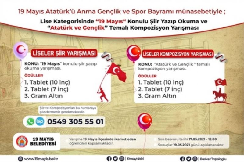 19 Mayıs Atatürk’ü Anma Gençlik ve Spor Bayramı dolayısıyla ilçede ikamet eden lise öğrencilerini kapsayan ve isteyen öğrencilerin ‘’ 19 Mayıs’’ konulu şiir yazıp-okuyup videosunu göndermesi, isteyen öğrencilerin ise ‘’ Atatürk ve Gençlik’’ konulu kompozisyon yazıp göndermesi ile düzenlenecek olan yarışmanın son başvuru tarihi 17.05.2021 saat:12.00 olarak belirlendi.