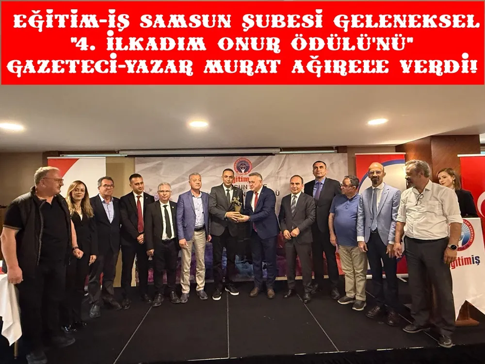 (SAMSUN)- Eğitim-İş Samsun şubesinin geleneksel hale getirdiği 4. İlkadım Onur Ödülü takdim törenine Birleşik Kamu-İş Konfederasyonu Genel Sekreteri Şükrü Balun, Eğitim-İş Genel Mali sekreteri Doğan Dağdelen ve CHP’li Samsun Milletvekili Murat Çan’ın katıldığı ve birer konuşma yaptıkları toplantı sonrasında geleneksel İlkadım Onur Ödülüne layık görülen gazeteci-yazar Murat Ağırel, konuşmasından sonra ödülü aldı. Ağırel daha sonra da kitaplarını imzaladı.