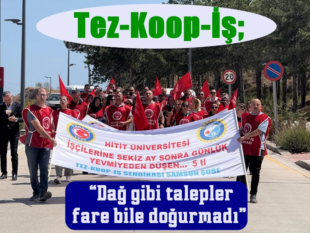 Tez-Koop-İş sendikası Samsun Şube olarak 14.08.2025 tarihinde almış olduğumuz yönetim kurulu kararı ile Greve kadar gidecek olan yolculuğumuzun ilk eylemini bugün burada Hitit Üniversitesi Rektörlüğü önünde gerçekleştiriyoruz. Aynı zamanda Karadeniz’de sekiz ilde Hitit üniversitesi işçilerine yapılan haksız uygulamayı yapacağımız eylem, yürüyüş ve basın açıklamaları ile tüm Türkiye kamuoyuna duyuracağımızı buradan basın aracılığıyla bildirmek istiyorum.