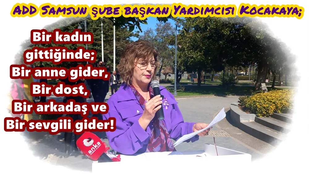 (SAMSUN)- ADD Samsun şubesi Onur Anıtı önünde 8 Mart Dünya Emekçi Kadınlar Günü nedeniyle bir basın açıklaması düzenledi. Düzenlenen basın açıklamasında ADD Samsun şube başkan yardımcısı Havva Kocakaya şöyle dedi.