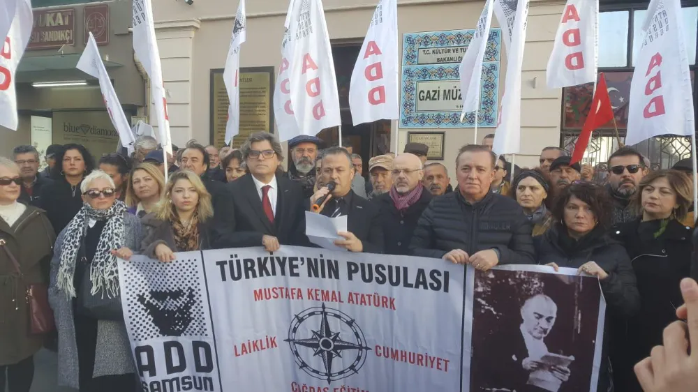 (SAMSUN)- ADD Samsun şube başkanlığının İlkadım ilçesinde bulunan Gazi Müzesi önünde üyeleriyle, STK ve siyasi partilerinde destek verdiği basın açıklamasında dernek başkanı Deniz Gömeç şöyle dedi.