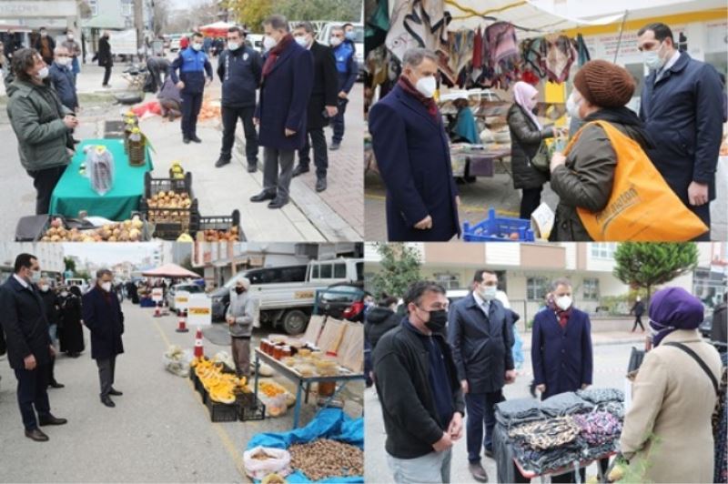 Atakum Belediye Başkanı Av. Cemil Deveci ve Belediye Başkan Yardımcısı Okan Saral, Zabıta Müdürlüğü ekiplerinin Cumhuriyet Mahallesi Azerbaycan Caddesi’ndeki pazar yerinde gerçekleştirdiği düzenleme ve denetimleri yerinde inceledi. Ömürevleri’nden giriş yaptığı pazar yerinde saha ziyaretini Türk-İş bölgesine kadar sürdüren Başkan Deveci, esnaf ve yurttaşları da dinledi. Samsun İl Hıfzıssıhha Kurulu’nun aldığı kararlar arasında esnafların tezgahlarından çıkan atıkları poşetlerde biriktirme zorunluluğu bulunduğunu belirten Başkan Cemil Deveci, Atakum Belediyesi Temizlik İşleri Müdürlüğü ekiplerinin tüm pazar yerlerinde dezenfeksiyon işlemi uyguladığını hatırlattı. Yaklaşık 10 aydır devam eden koronavirüs salgını nedeniyle Atakum’un yanı sıra Samsun ve tüm Türkiye’nin zor bir dönemden geçtiğini vurgulayan Başkan Deveci, “İl Hıfzıssıhha Kurulumuz salgının hızını yavaşlatmak için önemli kararlar alıyor. Biz de yerel yönetimler olarak bu kararları sahada uyguluyor ve devamlılığının sağlanması için aralıksız şekilde çalışıyoruz. Pazar yerleri çok sayıda yurttaşımızın bir araya geldiği kalabalık mekanlar. Bu nedenle kuralların pazarlarda eksiksiz şekilde uygulanması çok önemli. Zor günleri geride bırakabilmek için bu kurallara herkesin uyması gerekiyor. Atakumlular, salgın etkileri altında geçirdiğimiz 10 ayda eşsiz bir dayanışma içerisinde oldu. Bu dayanışmanın bundan sonra da süreceğine inanıyorum. Tüm hemşehrilerimin maske, mesafe ve temizlik kurallarına eksiksiz şekilde uymasını rica ediyorum” diye konuştu.