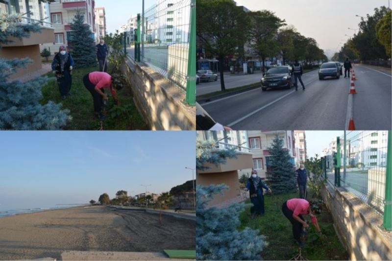 Atakum'un Mevlana mahallesindeki bir apartman sakinleri ellerindeki bel ve kazmalarla bahçelerini düzenlemeye çalışırken büyük bir kısmı da evlerinden ayrılmadan kısıtlama sürecine uymaya çalıştılar.