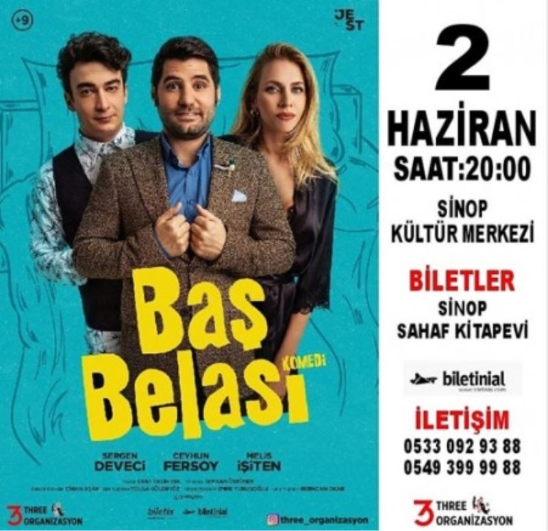 3 Three Organizasyonun organize ettiği ve Sinoplu izleyicilerle buluşturmak için Eray Yasin Işık’ın yazdığı, Serkan Üstüner’in yönettiği BAŞ BELASI’nı başarılı oyuncular, Ceyhun Fersoy, Melis İşiten ve Sergen Deveci'nin seyirciyi kahkahaya boğduğu tiyatro oyunu Sinop Kültür Merkezi Sahnesinde izleyicisiyle buluşuyor.