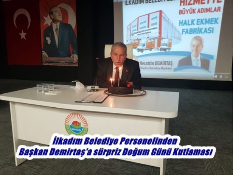 SAMSUN- İlkadım Belediyesi personeli, Başkan Necattin Demirtaş için sürpriz bir kutlama hazırlayarak, doğum gününü kutladı. Müdürler toplantısına katılacağı düşüncesiyle Konferans Salonuna gelen Başkan Demirtaş, dünden bugüne gençlik yıllarına ait fotoğraflarını yer aldığı video gösterimi sonrası şaşkınlığını gizleyemedi.