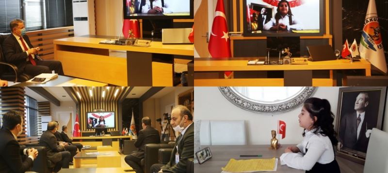 SAMSUN- 23 Ulusal Egemenlik ve Çocuk Bayramı’nda makam koltuklarını çocuklara devretme geleneği, Atakum Belediyesi’nde koronavirüs salgını önlemleri nedeniyle telekonferans yoluyla gerçekleştirildi. İlkokul birinci sınıf öğrencisi 7 yaşındaki Derin Şencan, evinde Türk Bayrakları, Mustafa Kemal Atatürk’ün fotoğrafı ve büstü ile oluşturduğu özel alandan telekonferansla başkanlık makamına konumlandırılan ekrana bağlandı. Atakum Belediye Başkanı Av. Cemil Deveci’den canlı bağlantı ile görevi devralan minik başkan Şencan sözlerine, “Ulu Önderimiz Mustafa Kemal Atatürk’ün tüm dünya çocuklarına armağan ettiği 23 Nisan Ulusal Egemenlik ve Çocuk Bayramımız kutlu olsun” ifadeleri ile başladı.