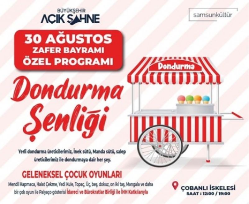 Açık Sahne Yaz Etkinlikleri’ nin 30 Ağustos Zafer Bayramı özel programı kapsamındaki “Dondurma Şenliği”, Çobanlı Halk İskelesi Açık Sahne Etkinlik Alanı’nda 12.00-19.00 saatleri arasında düzenlenecek. Büyükşehir Belediyesi Kent Orkestrası da katılımcılara konser verecek.