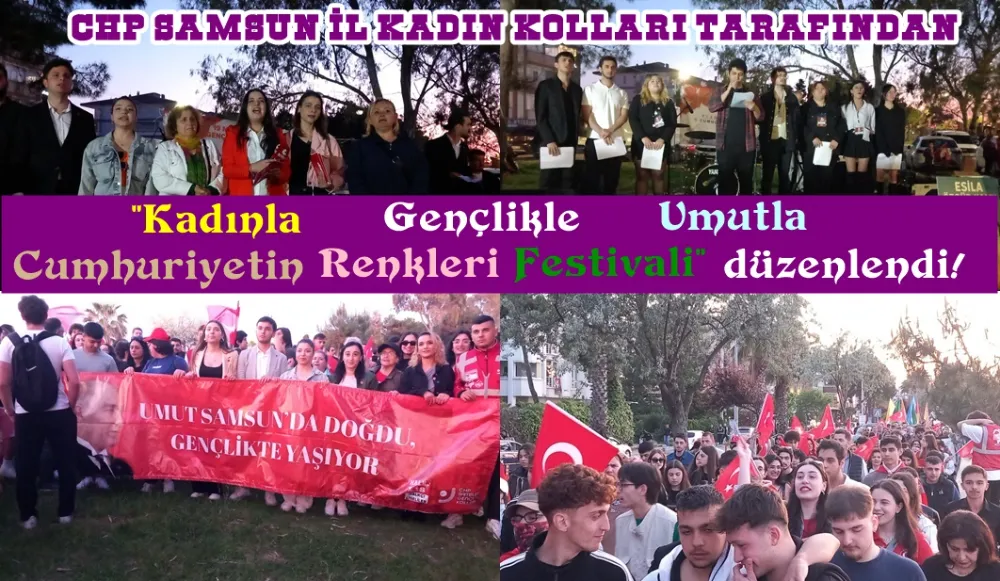 (SAMSUN)- 19 Mayıs etkinlikleri kapsamında CHP Samsun il kadın kollarının düzenlediği, ilçe kadın kolları ve gençlik kollarının da katkısıyla düzenlenen “Kadınla gençlikle umutla Cumhuriyetin renkleri festivali” Atakum Çobanlı iskelesinden Türkiş’e kadar il ve ilçe gençlik kollarıyla halktan gençlerin yanı sıra CHP’li Samsun Milletvekili Murat Çan, CHP il başkanı Mehmet Özdağ, Aydın Atatürkçü Gençlik ve Samsun Üniversitesi gençlerinde katılımıyla Türkiş’te sahil kenarında kurulan platformda festival öncesinde CHP’li milletvekili Çan ve CHP’li kadın kolları başkanı Nilsu İrem Koçyiğit Bahadır birer konuşma yaptılar.