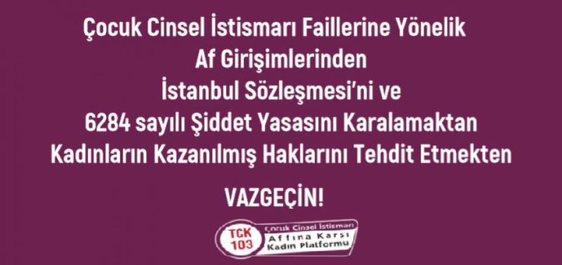 Çocuk Cinsel İstismarı Affına Karşı Kadın Platformu ; “Bu nedenle, çocuk cinsel istismarcılarına af girişimlerini ertelemenizi değil; bu niyetinizden derhal ve tamamen vazgeçmenizi ve bunu kamuoyuna ilan etmenizi bekliyoruz. Kadına Karşı Şiddetle İlgili İstanbul Sözleşmesi’ne Karşı Çıkmak Şiddetçi Erkeklere Teşvik, Tüm Kadınlara Tehdittir Özellikle TBMM Boşanma Komisyonu Raporu’ndan beri İstanbul Sözleşmesi ve 6284 sayılı yasaya karşı sistematik bir karalama kampanyası yürütülmektedir. Birkaç marjinal grup tarafından yürütülmesine rağmen, Türkiye’de bu kampanya nedeniyle ne İstanbul Sözleşmesi, ne de 6284 sayılı yasa etkili bir biçimde uygulanmaktadır. Numan Kurtulmuş’un son açıklaması da taraf olan ülke sayısının her geçen gün arttığı şiddete karşı bu çok önemli sözleşmeyi ve yasayı uygulamamak için zaten direnmekte olan tüm kamu görevlilerine, yeni ve güncel “talimat” niteliği taşımaktadır. Bu gibi açıklamaların, şiddet uygulayan erkekleri teşvik etmek; şiddete maruz kalan birçok kadının devlet mekanizmalarına başvurma cesaretlerini kırmak gibi olumsuz sonuçları olacaktır. TCK 103 Çocuk Cinsel İstismarı Affına Karşı Kadın Platformu’nu oluşturan 237 kadın örgütü olarak; - Kadınlara ve kız çocuklarına yönelik fiziksel, cinsel, psikolojik ve ekonomik şiddet ile ayrımcılığı körükleyen bu söylemlerinize son verin; - İstanbul Sözleşmesi ve 6284 sayılı yasayı uygulayın; - Çocuk istismarcılarına af çıkarmak, adındaki İstanbul kelimesi kadar “yerli ve milli ama bir o kadar da evrensel” bir sözleşmeden Türkiye’nin imzasını çekmek gibi; kadına karşı şiddetle mücadeleden vazgeçildiğinin ilanı anlamına gelecek, toplum vicdanını yaralayacak çılgın projelerden derhal vazgeçin diyoruz. Kadınlar ve çocuklarla ilgili konuların toplumsal ve siyasal tarafı, kadınların ve çocukların hakları için yıllardır mücadele eden kadın örgütleridir. Kadın örgütleri, birlikte kararlaştırılmayan, kadın haklarında gerileme anlamına gelecek her bir adıma sonuna kadar karşı çıkacaktır. Çocuk Cinsel İstismarı Faillerine Yönelik Af Girişimlerinden İstanbul Sözleşmesi’ni ve 6284 sayılı Şiddet Yasası’nı Karalamaktan Kadınların Kazanılmış Haklarını Tehdit Etmekten VAZGEÇİN” dediler.