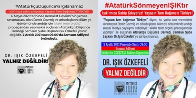 Atatürkçü Düşünce Samsun Şube Başkanımız Dr. Işık Özkefeli 6 Mayıs 2021 tarihinde Deniz Gezmiş ve arkadaşlarını ölümlerinin 49. yılında sosyal medya hesaplarından andığından dolayı hakkında açılan soruşturma ve dava neticesi