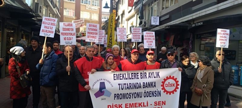 DİK Emekli-Sen Samsun Şube Başkanı Tacettin Aydın açıklamasının sonunda şunları ifade etti. 'Biliyorsunuz ki 1990 yılından itibaren kamu çalışanlarının aylıkları bankalar aracılığı ile ödenmeye başlandı ve bankalar daha çok kamu emekçisinin aylığını kendi bankasında toplayabilmek için ilgili kurumlara promosyon adında ödemelere başladılar. Ödenen bu promosyonlar ilk dönemlerde tamamen kamu kurumlarının kendi ihtiyaçları için harcandı. Sonradan sendikaların verdiği mücadele ile bu tutarların tamamı çalışanların kendilerine ödenmeye başlandı. Bu konuda bir çok Başbakanlık genelgeleri yayınlanarak ödemelerin esasları kurallara bağlanmış oldu. Ancak bu uygulama emekliler için hayata geçirilmedi. Ta ki üç yıl öncesine kadar. Sendikamızın mücadelesi sonucunda üç yıl önce Sosyal Güvenlik Kurumunun bankalarla yapmış olduğu sözleşme sonucunda emeklilere 300 ile 450 TL arasında bir ödeme gerçekleşmiştir. Ancak bu tutar o günün koşullarına göre taleplerimizin ve olması gerekenin çok altındaydı. Bu rakamın açıklanmasından hemen sonrasında bile bir çok banka, emeklileri arayarak bu tutarın çok üzerinde promosyon tekliflerinde bulunmuşlardır. Bugün geldiğimiz noktada ise 1250 TL nin üzerinde teklif veren bankalar mevcuttur. Bu durum göstermektedir ki iyi bir pazarlık veya ihale yöntemiyle üç yıllık bir süre için en az bir aylık tutarında promosyon miktarı mümkündür ve emeklilerin hakkıdır. Taban sınır asgari ücretin altında kalmamak üzere bir aylık tutarında promosyon talebimizi buradan haykırıyoruz. Sosyal Güvenlik Kurumunu 2007/21 Sayılı Başbakanlık genelgesine uyarak sendikamızın da içinde olduğu bir komisyon kurulmasını, bankalarla yapılacak olan görüşmelerin bu komisyon tarafından yürütülmesini ve bir aylık tutarın altında bir rakama imza atmaması konusunda uyarıyoruz. Konunu takipçisi olacağız ve asla taviz vermeyeceğiz' dedi.