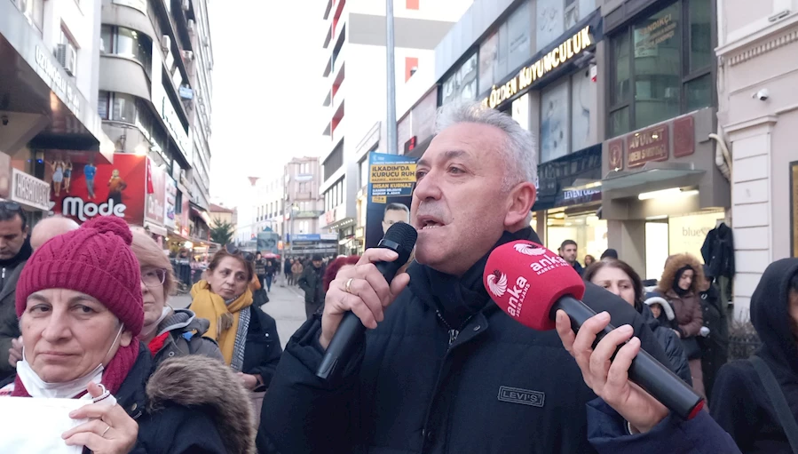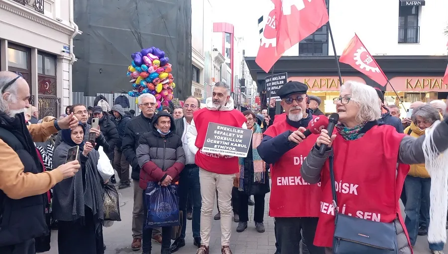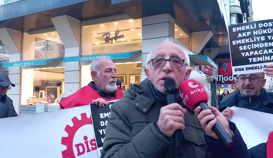 “Sevgili çok kıymetli emekli dostlarımız. Bu yıl biliyorsunuz en çok tartışılan, gündemin birinci maddesi emeklilikte emeklilerin alacağı zamlar oldu. Kuruşun hesabını yapan iktidar, aylardır tartışa tartışa bitiremedi. Gıdım gıdım her gün bir gıdım daha yükselterek, tepkilerimizin sonucunda bir noktaya vardı gibi görünüyor. Ve çıktı en yetkili ağız şunu söyledi, 2024 yılı emeklilerin yılı olacak dedi. Vallahide yalan, billahi de yalan. Verdikleri paralar, verecekleri paralar, daha ceplerinden hazineden çıkmadan, zaten tükendi bitti. Emeklileri, emekliler ile dalga geçilen bir yıl oldu. Emekliler sefalet ve yoksulluk ücretini kabul etmiyorlar. Emekliler, açlık sınırının altında yaşamayı kabul etmiyorlar. Emekliler her geçen gün, sofralarından eksilen lokmalarıyla yaşamak istemiyorlar. Emekliler yıllarca, bu ülkeye hizmet etmiş, değer üretmiş insanlar. Sonucunda da gelişmiş ülkeler gibi hakça paylaşım, adil bir paylaşım istiyorlar ve insanca yaşamak istiyorlar. İnsanca yaşamak istiyoruz. En düşük emekli aylığının, 10 bin liraya yükseldiği gerçeği yansıtmıyor. Aylıklara seyyanen ya da oransal olarak, bir artış yapılmadığı kök maaşlara yansıtılmadığı sürece, bütün rakamlar aldatmacadır. Bunun bir aldatmaca olduğunu, gerçeği yansıtmadığını, TÜİK’in açıkladığı doğru olmayan, enflasyonun çok çok altında olduğunu, Pazar gittiğimizde, boş filelerimizden, boş çantalarımızdan, önünden geçemediğimiz kasaplardan, manavlardan, sosyal hayatı, konforu, lüksü artık bir kenara bıraktık. İnsanca yaşamak beslenebilmek, ilacımızı alabilmek, sağlıklı bir sağlık hizmeti alabilmek, torunlarımızın karşısına alnımız ak çıkabilmek, soframızda çorbamızı, etimizi, sütümüzü, yumurtamızı, sofraya koyabilmek için çabalıyoruz. Bizler çoktan insanca yaşamayı hak ettik. Gezmek, eğlenmek, tatil yapmak, termallere gitmek, hak ettiğimiz şeyler bunlar, konfor değil. Bizler doğalgazımızın düğmelerini açamaz hale geldik. Battaniyelerin altında, kışı geçirmeye çalışıyoruz. Bırakın insanca yaşamayı, bırakın konforu en temel yaşamsal, ihtiyaçlarımızı karşılayamaz haldeyiz. Bu rakamlara aldanmıyoruz. Bunu kabul etmiyoruz. Bunu hak etmediğimizi düşünüyoruz. Ve hakkımızı alana kadar, bu sokaklarda olacağımızı söylüyoruz. Biz bu sokakları terk etmeyeceğiz. Biz bu koşullara oyun olmayacağız. Nasıl ki, sermayenin vergi borçlarını affedebiliyorsun, silebiliyorsun, nasıl ki hiç kullanılmayacak, hiç geçmeyeceğin, köprülere, yollara, milyarları harcayıp, rant oluşturuyorsun, yandaşlarını, zengini daha zengin ediyorsun ama bunu benim soframdan çalarak yapıyorsun. İşte biz bu 2024 yılının bayram olmadığını emekliler için kutlanacak, sevinilecek bir durum olmadığını, anlatmak için, dert yanmak yerine, enerjimizi, mücadele azmimizi sizlere de yansıtmak için, ayaktayız demek için, bugün davullu zurnalı bir tersinden protesto yapmayı, uygun gördük. Hepinizi bu mücadeleye, bize destek vermeye bekliyoruz. Yaşasın DİSK Emekli-Sen, yaşasın emeklilerin mücadelesi, yaşasın birliğimiz ve dayanışmamız diyorum. Sevgili dostlar, emekli olup da bende iki laf söylemek istiyorum, bundan bende rahatsızım, bu gidişattan diyen varsa, mikrofonumuz bugün, halka, katılımcılara, hepsine açık olacak. Buyurun mikrofon sizin.”