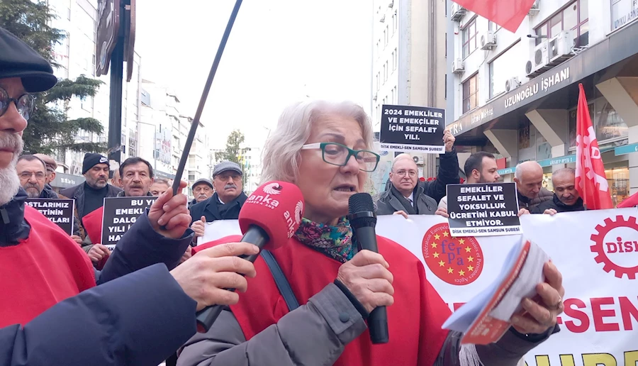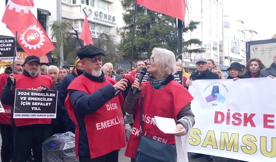 Emekli Mustafa Erkenet; “Samsun’da ki, emek dostlarını, birlikte mücadeleye çağırıyorum. Emekliler insanca yaşamak istiyor. Tüm sefalet ücretlerine karşı hayır diyor. Bunun için hasta katkı paylarına, hayır diyoruz. Tüm kamu çalışanlarına verilen, 8.077. Liranın tüm emeklilere verilmesini talep ediyoruz. Bunun için tüm Samsun emek dostlarını, tüm emeklileri bu sefalete, bu yoksulluğa, bu zamlara, bu çekilmez yaşam koşullarına karşı, birlikte mücadeleye çağırıyoruz” diye konuştu.
