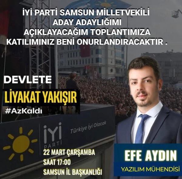 Millet ittifakının ortaklarından Samsun İYİ partide de aday adayları görücüye çıktılar ve aday adaylıklarını ilan ettiler. Yazılım mühendisi olan Efe Aydın ‘da bugün kalabalık bir kitleye aday adaylığını ilan etti.