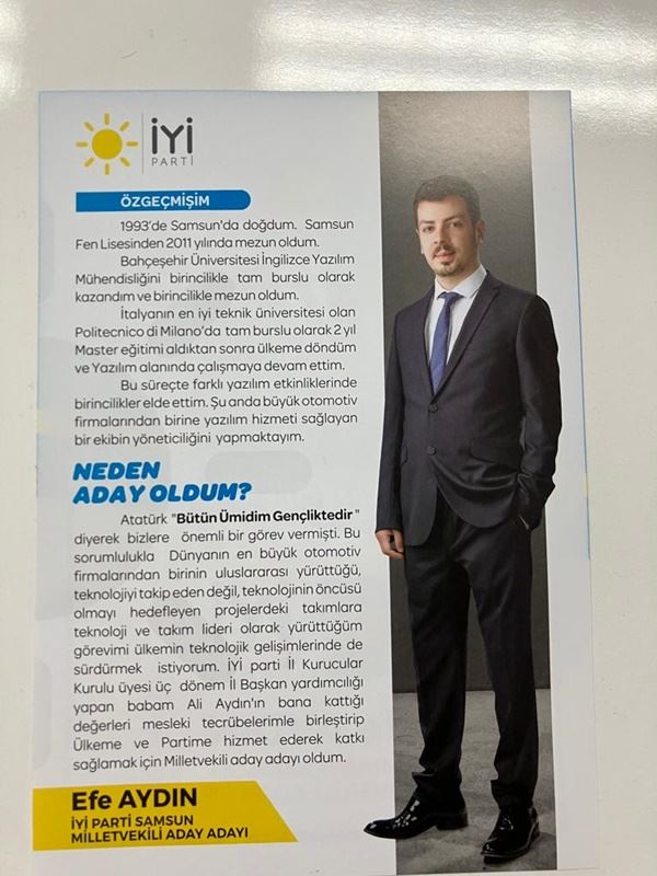 Efe Aydın açıklamasının devamında; Atatürk ‘Bütün Ümidim Gençliktedir’ diyerek bizlere önemli bir görev vermiştir. Bu sorumlulukla Dünyanın en büyük otomotiv firmalarından birinin uluslararası yürüttüğü, teknolojiyi takip eden değil, teknolojinin öncüsü olmayı hedefleyen projelerdeki takımlara teknoloji ve takım lideri olarak yürüttüğüm görevimi ülkemin teknolojik gelişmelerinde de sürdürmek istiyorum. İYİ parti il kurucular kurulu üyesi 3 dönem il başkan yardımcılığı yapan babam Ali Aydın’ın bana kattığı değerleri mesleki tecrübelerimle birleştirip ülkeme ve partime hizmet ederek katkı sağlamak için milletvekili aday adayı oldum” dedi.