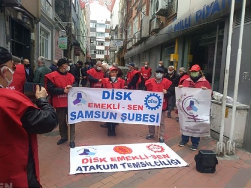Samsun Emekli-Sen Şubesi bugün sendika binası önünde üyeleriyle birlikte bayramlarda emeklilere verilen ikramiyelere verilecek zamlarla ilgili olarak açıklamalarda bulundular.