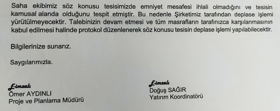 YEDAŞ Genel Müdürlüğü’nün verdiği yanıtta “Saha ekibimiz söz konusu tesisimizde emniyet mesafesi ihlali olmadığını ve tesisin kamusal alanda olduğunu tespit etmiştir. Bu nedenle şirketimiz tarafından deplase işlemi yürütülmeyecektir. Talebinizin devam etmesi ve tüm masrafların tarafınızca karşılanmasının kabul edilmesi halinde protokol düzenlenerek söz konusu tesisin deplase işlemi yapılabilecektir.” denildi.