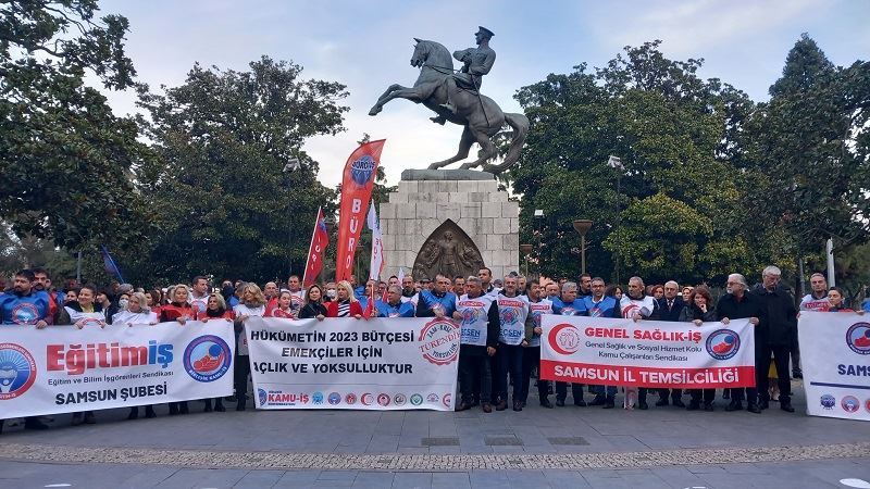 Birleşik Kamu-İş Samsun şube başkanı Gündüz; “2002 yılında en düşük emekli aylığı asgari ücretin 53 Türk lirası üzerindeyken, yapılan son zamlarla birlikte asgari ücret en düşük emekli aylığının 3 bin Türk lirası üzerine çıkmıştır. Sorun asgari ücretin çok artırılması değil, kamu çalışanları ve emeklilerinin ücretlerinin komik ve acınacak artışlara maruz kalmasıdır. Cumhurbaşkanı’nın önce yüzde 25 olarak açıkladığı sonra danışıklı bir şekilde yandaş sendikanın talebiymiş gibi önceden belirlenmiş yüzde 30 oranı bahşiş dağıtır gibi kamu çalışanlarına müjde olarak sunulmuştur. Yandaş sendikalar her ne kadar ülke şartlarını ve ekonomik krizi görmezden gelip her toplu sözleşme döneminde kamu çalışanlarını masada sattığı gibi bugün yine kuruluş amaçlarına göre hareket ederek verilen bu bahşişi ayakta alkışlamıştır. Kamu çalışanları ve emekliler olarak; ülke şartlarına ve ekonomik krize bakılmaksızın açıklanan sefalet artışını kabul etmiyoruz. Kamu çalışanlarının görüşleri ve talepleri dinlenmeden kapalı kapılar ardında verilen bahşişleri kabul etmiyoruz. Kamu çalışanlarının ve emeklilerinin maaşları olağanüstü dönemden geçtiğimiz bu süreçteki artış oranları açılan yarayı derinleştirmekten başka bir işe yaramayacaktır. Kamu çalışanları ve emeklilerin maaşları tüm kamu sendikalarının talepleri doğrultusunda yeniden belirlenmelidir. Kamu Konfederasyonları platformu olarak; kamu çalışanlarının en düşük maaşının yoksulluk sınırı olan 26 bin 124 liraya yükseltilerek enflasyon oranının da her ay seyyanen maaşlara yansıtılmasını talep ediyoruz. Kamu emekçileri düşük emekli maaşlarına mahkûm edilmekte, emekli olmamıza rağmen ölene kadar çalışmak zorunda bırakılmaktayız. Emekli olduğumuz zaman maaşlarımızdan yapılan yüksek kesintilerle maaşlarımızın yarısından fazlası elimizden alınarak bizler açlığa mahkûm edilmekteyiz. En düşük kamu emekçisi maaşı ise asgari ücrete eşitlenerek her ay enflasyon farkı seyyanen eklenmeli ve emekli olduğumuz zamanki hayat standartlarımızı kaybetmemek adına emekli olduğumuz zamanki maaşlarımıza yakın bir maaş talep etmekteyiz” şeklinde konuştu.