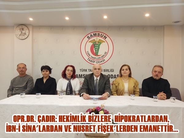 Samsun Tabip Odası adına Dr. Çadır; “Biliriz ki; toplum sağlıklıysa biz sağlıklıyız, biz sağlıklıysak toplum sağlıklı… Yine biz biliriz ki; bilim ve tıbbın kaygısı toplumsa, canlıların sağlığıysa, onu savunmak cesaret gerektirir. Hekimlik Andı aldığımız bu sorumluluğun topluma verilmiş bir garantisidir. Yani bizi susturacaklarını zannedenler bilsin ki; “Bizler öyle bir yemin ettik ki dönmeyiz, dönemeyiz.” Hipokrat’lardan, İbn-i Sina’lardan, Nusret Fişek’lerden bize emanettir; topluma verdiğimiz bu söz, bu cesaret, bu sağlık ve emek mücadelesi. TTB de, insanlık tarihi kadar köklü böylesi mücadelenin yakın tarihteki somutlaşmış örneklerinden biridir sadece. Ve TTB herhangi bir iktidara yaslanmayı hiçbir zaman kabul etmemiş; eleştirel/bilimsel/etik aklı en büyük dayanak kabul etmiştir. Mücadelesi uzun solukludur. TTB’nin özelleştirmelerle, ülke imkanlarını sermayedarlara akıtan Şehir Hastaneleriyle, niteliksiz / Tabela Üniversitesi eğitimleriyle, basamaklı uygulamayı yok eden sağlık sistemiyle, emeğimizin sömürülmesiyle, doğanın yok edilmesiyle, en yoğununu yaşadığımız, hayatın her alanına sindirilmeye çalışılan şiddetle mücadelesi bu uzun soluklu mücadelelerden bazılarıdır” şeklinde konuştu.