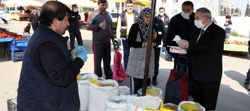 Başkan Necattin Demirtaş pazarcılar ile bir araya gelerek esnafa tıbbi maske ve eldiven dağıttı.