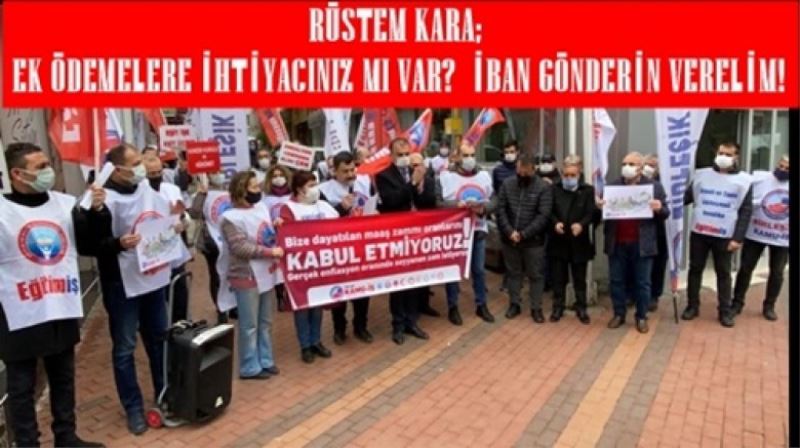 Rüstem Kara açıklamasının bu bölümünde tepkilerini şöyle dile getirdi. “Yapılan bu toplu sözleşmelere bağlı olarak; memur ve emekliler oyalanmaktadır. Memur maaşları erimekte alım gücü düşmektedir. Memur maaşlarına yalnızca enflasyon kadar zam yapılmakta bu zam da altı ay geriden gelmektedir. TÜİK, sepet oyunlarıyla enflasyonu eksik hesaplayarak, kötü ekonomi yönetiminin yol açtığı yüksek enflasyonu gizleyerek bütün faturayı emekçilere ödetmektedir. Halkın; çarşıda, pazarda karşı karşıya kaldığı gerçek enflasyon, halkın enflasyonu verilerine göre yüzde 29,9’dur. Milyonlarca kamu emekçisi, emeklisi ve ailelerini sevindirecek ve her dönem yaşadığımız kayıpların giderilmesini sağlayacak koşullar şunlardır: Siyasi iktidar ve TÜİK, enflasyonu gizleyen anlayışını ve sahte verilerle açıklanan oranları terk etmelidir. Öncelikle kamuda eşitliği sağlayacak “eşit işe eşit ücret” kapsamında yeni bir düzenleme yapılmalı sonrasında yüzdelik zamlar verilmelidir. Kamu çalışanlarımızın kayıpları telafi edilmeli, toplu sözleşme masası yeniden kurulmalı ve memurlarımıza ek zam verilmelidir. Kamu çalışanları ve emeklilerimizin sadece satın alma gücünün korunabilmesi için maaşlarına en az yüzde 30 oranında zam yapılmalıdır. Asgari ücret vergi dışı bırakılmalıdır. Vergi dilimleri yüzde 15’ten yüzde 10 düşürülmelidir ve sabit tutulmalıdır. Birleşik Kamu-İş Konfederasyonu olarak; tüm kamu emekçilerini ve emeklilerimizi insanca yaşamaya yetecek maaş ve ücret düzenlemesi için, birlikte mücadele etmeye çağırıyoruz” dedi.