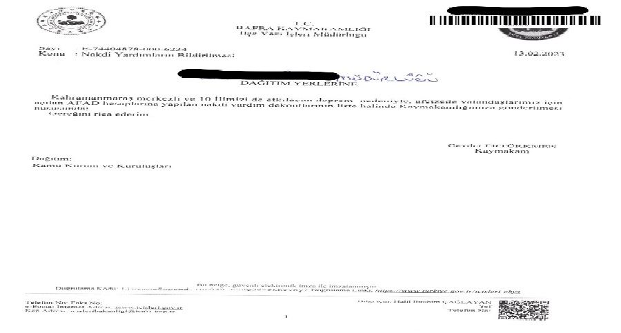 Bafra Kaymakamı Cevdet Ertürkmen imzası ile gönderilen “Nakdi Yardımların Bildirilmesi” konulu yazıda “Kahramanmaraş merkezli ve 10 ilimizi de etkileyen deprem nedeniyle, afetzede vatandaşlarımız için açılan AFAD hesaplarına yapılan nakdi yardım dekontlarının liste halinde Kaymakamlığımıza gönderilmesi hususunda; gereğini rica ederim” ifadesi yer aldı.