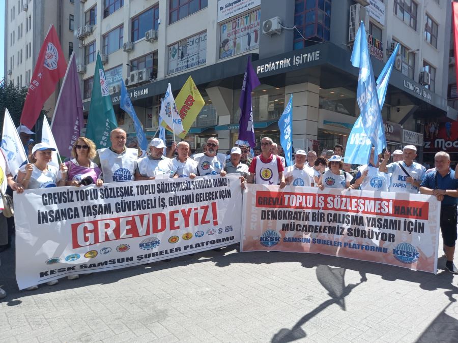 KESK Samsun şubler platformu üyeleri İlkadım ilçesi Gazi üzesi önünde kalabalık bir kitle ile birlikte yaptıkları basın açıklamasında KESK Samsun şubeler platformu adına Tüm Bel-Sen Samsun şube yönetim kurulu üyesi Akın Ömür yaptığı konuşmasında şunları ifade etti. “Merhaba! Güneşin bu kavurucu sıcağında işine, ekmeğine sahip çıkmak için ter dökenler. Merhaba! Çocuklarına onurlu bir gelecek bırakmak için gecesini gündüzüne katanlar. Merhaba! Kapı kulu değil emekçi olduğunu haykıranlar. Merhaba! Grevsiz Toplu Sözleşme, Toplu Sözleşmesiz Sendika Olmaz diyenler. Merhaba! Türkiye kamu emekçileri mücadele tarihini “Haklar yasalardan önce gelir” “Hak Verilmez, mücadele ile alınır” diyerek ilmek ilmek yazanlar. Hak ve özgürlüklerine sahip çıkan kamu emekçileri olarak, KESK’liler olarak bugün Türkiye’nin dört bir yanında alanlarda, sokaklardayız” diye ifadelerde bulundu.