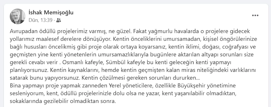“Avrupa’dan ödüllü projelerimiz varmış, ne güzel. Fakat yağmurlu havalarda o projelere gidecek yollarımız maalesef dereler dönüşüyor. Kentin önceliklerini umursamadan, kişisel öngörülerinize bağlı hususları öncelikmiş gibi proje olarak ortaya koyarsanız, kentin iklimi, doğası, coğrafyası ve geçmişten yine kenti yönetenlerin umursamazlıklarıyla bugünlere aktarılan altyapı sorunları size gerekli cevabı verir. Osmanlı Kafeyle, Sümbül kafeyle bu kenti geleceğin kenti yapmayı planlıyorsunuz. Kentin kaynaklarını, hem de kentin geçmişten kalan miras niteliğinde ki varlıklarını satarak bunu yapıyorsunuz. Kentin çözülmesi gereken sorunları dururken, bina yapmayı proje yapmak zanneden yerel yöneticilere, özellikle Büyükşehir yönetimine sesleniyorum, kent, ödüllü projelerinizle dolu olsa ne yazar, kent yaşanabilir olmadıktan, sokaklarında gezilebilir olmadıktan sonra.”