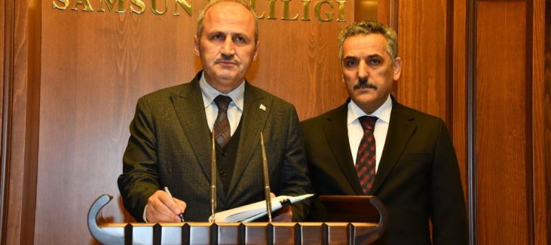 Samsun valisi Osman Kaymak, Vali Yardımcıları ve ilgili kurum müdürleri tarafından karşılanan Ulaştırma ve Altyapı Bakanı Mehmet Cahit Turhan, Valilik Şeref Defteri’ni imzaladıktan sonra valiyi makamında ziyaret etti.