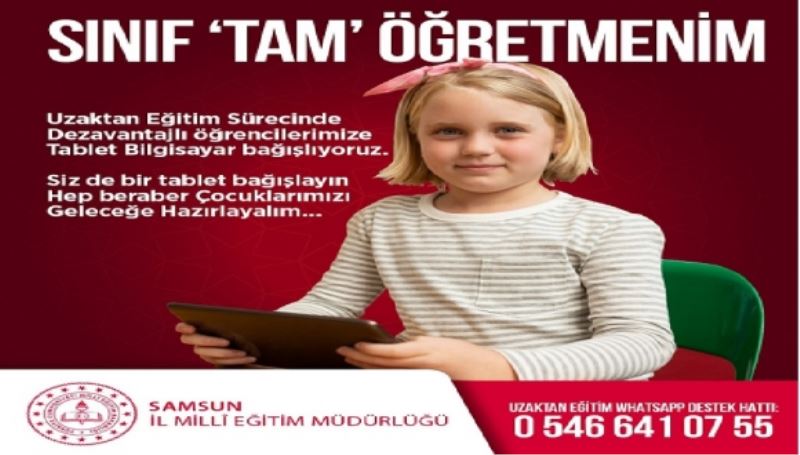 SAMSUN- Samsun İl Milli Eğitim Müdürlüğü, Kovid-19 sürecinde internet erişimi, internete bağlanacak cihazı veya evinde televizyonu olmayan ve özellikle EBA Destek Noktalarına ulaşım konusunda sorun yaşayan, kırsal kesimdeki yerleşim yerlerinde bulunan öğrenciler ile bunlardan karantina vb. gibi sebeplerle evlerinden çıkamayacak durumdakilerin EBA canlı derslerden ve EBA portalından yararlanmalarını sağlamak amacıyla “Öğretmenim Sınıf Tam” projesini hayata geçirdi. Proje kapsamında öğrencilerin EBA ve canlı derslere ulaşması için tablet bağış kampanyası başlatıldı.