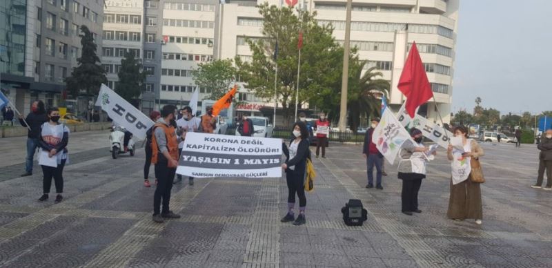Samsun Demokrasi Güçleri; “Bir avuç zenginin; sömürü çarkının dönmesi, karlarının devamı için, her gün otobüslerde, servislerde işe gitmek zorunda kalan binlerce işçiyi görmeyen, ölüme gönderen, 5 adet maskeyi dağıtamayan AKP-MHP faşizmi, 1 Mayıs için basın açıklamasını 5 kişi ile sınırlandırabiliyor. Bugün için Samsun halkına 1 Mayıs’ın önemini hatırlatmak, birlik mücadele ve dayanışma içerisinde olduğumuzu vurgulayarak moral yaratmak için planladığımız, araçla sesli yayın talebimiz; salgın koşulları bahane edilerek Samsun Valiliği tarafından reddedilmiştir. Salgın/ölüm koşullarında yüzlerce işçinin bir arada çalışmasını reva gören akıl, iki kişinin olacağı bir aracı sözde salgın tehlikesi olarak görebiliyor. Bizler biliyoruz ki, bu çürümüş bitmek üzere olan düzeninizde en çok korktuğunuz örgütlü mücadelemizdir. İşçilerin birliği-halkların kardeşliğidir, kadın mücadelesidir korktuğunuz. Asla yılmadan mücadelemize devam edeceğiz. Dünyadaki benzerleri gibi AKP/Saray rejimi de salgının ilk anından itibaren iktidarının devamından, sermayenin karından başka hiçbir şey düşünmedi. Hatırlayalım, salgın tehlikesi kapımıza dayanmışken AKP iktidarı Suriye ve Libya topraklarında savaşla, Avrupa ile mülteciler üzerinden pazarlıkla uğraşmaya devam ediyordu! “Önlem paketi” diye sermayeyi kurtarma programı açıkladılar. İşçiye, emekçiye, küçük esnafa, çiftçiye kadınlara adeta “ne haliniz varsa görün” dediler. Salgında siyasî tutsakları, kadın ve çocukları zindanda tutan AKP-MHP iktidarı; katil erkeği evine gönderdi; mafyacıları, hırsızları afla ödüllendirdi. Kar ve rant için ihaleler düzenlendi, doğa talanı ve kıyımı devam etti-ediyor. Salgında izledikleri politikalar ile yüzbinlerce insan ücretsiz izne çıkartıldı, işten atıldı; işsiz, gelirsiz kaldı, hâlihazırda işsiz olan milyonlar çaresiz bırakıldı, çiftçi ekim yapamadı, borcuyla baş başa bırakıldı. Ama faturalar gelmeye, vergiler alınmaya, borç faizleri işlemeye devam etti! Halkımız kira, fatura, beslenme giderlerini karşılayamaz duruma getirildi, açlıkla baş başa bırakıldı” dediler.