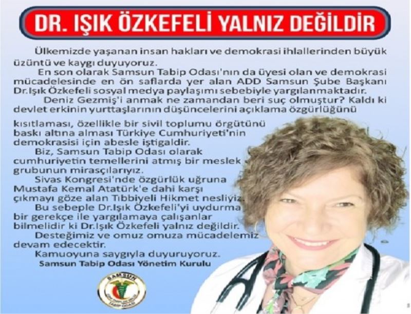 Samsun tabip Odası meslektaşları ve ADD Samsun Şube Başkanı Drç Işık Özkefeli’nin sosyal medyada Deniz Gezmişlerin anmasıyla ilgili açılan davaya destek olmak için yaptığı açıklamasında şunları kaydetti. “Ülkemizde yaşanan insan hakları ve demokrasi ihlallerinden büyük üzüntü ve kaygı duyuyoruz. En son olarak Samsun Tabip Odası’nın da üyesi olan ve demokrasi mücadelesinde en ön saflarda yer alan ADD Samsun Şube Başkanı Dr.Işık Özkefeli sosyal medya paylaşımı sebebiyle yargılanmaktadır. Deniz Gezmiş’i anmak ne zamandan beri suç olmuştur? Kaldı ki devlet erkinin yurttaşlarının düşüncelerini açıklama özgürlüğünü kısıtlaması, özellikle bir sivil toplumu örgütünü baskı altına alması Türkiye Cumhuriyeti’nin demokrasisi için abesle iştigaldir. Biz, Samsun Tabip Odası olarak cumhuriyetin temellerini atmış bir meslek grubunun mirasçılarıyız. Sivas Kongresi’nde özgürlük uğruna Mustafa Kemal Atatürk’e dahi karşı çıkmayı göze alan Tıbbiyeli Hikmet nesliyiz. Bu sebeple Dr.Işık Özkefeli’yi uydurma bir gerekçe ile yargılamaya çalışanlar bilmelidir ki Dr.Işık Özkefeli yalnız değildir. Desteğimiz ve omuz omuza mücadelemiz devam edecektir” dediler.