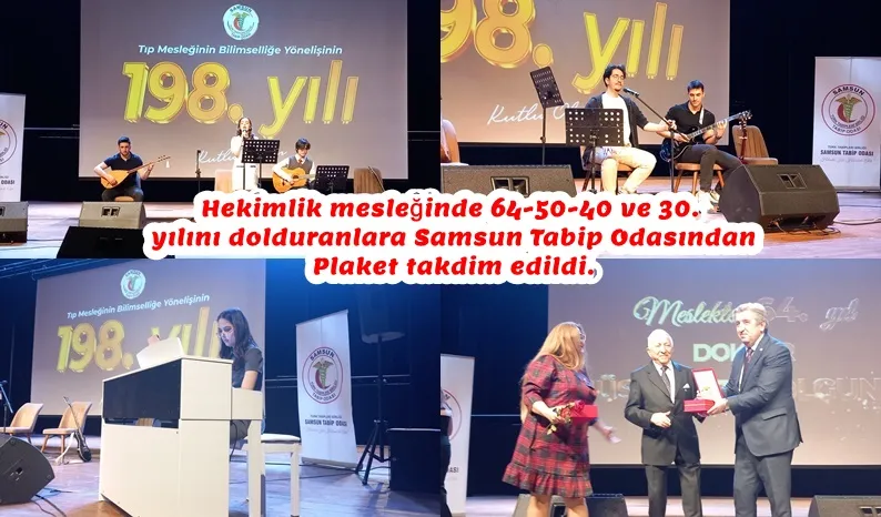(SAMSUN)- Samsun Tabip Odasının 14 Mart Tıp Bayramı nedeniyle Atakum belediyesinin Ata Sanat merkezinde dün akşam kendisi de hekim olan CHP’li Samsun Milletvekili Dr. Murat Çan, Samsun Tabip Odası TÖK (Tıp Öğrenci Kolu) başkanı Süleyman Taha Kılıç, Tabip Odası başkanı Dr. Sema Aydoğdu ve DR. Nedim Ecevit’in de birer konuşma yaptıkları plaket törenin de hekimlik mesleğinde 64,50,40 ve 30 yıllarını dolduranlara plaketleri takdim edildi.