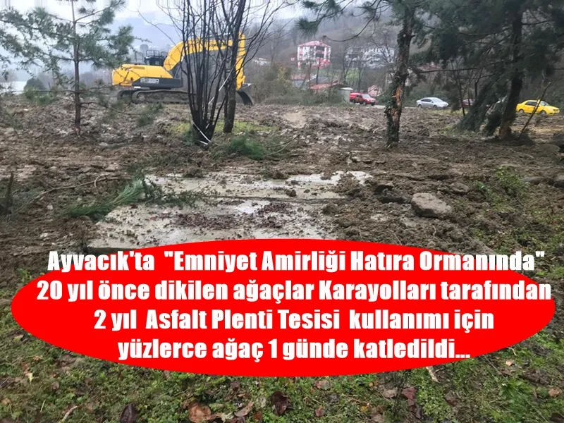 Ayvacık ilçesi Orta mahallede 2 yıl süreyle kullanması için Milli Emlak tarafından Karayollarının Asfalt Plenti Tesisi kurması için “Ayvacık İlçe Emniyet Amirliği Hatıra Ormanına 20 yıl önce dikilen çam, akasya ve birçok ağaç türleri iki gün için de yerle yeksan edildiler.