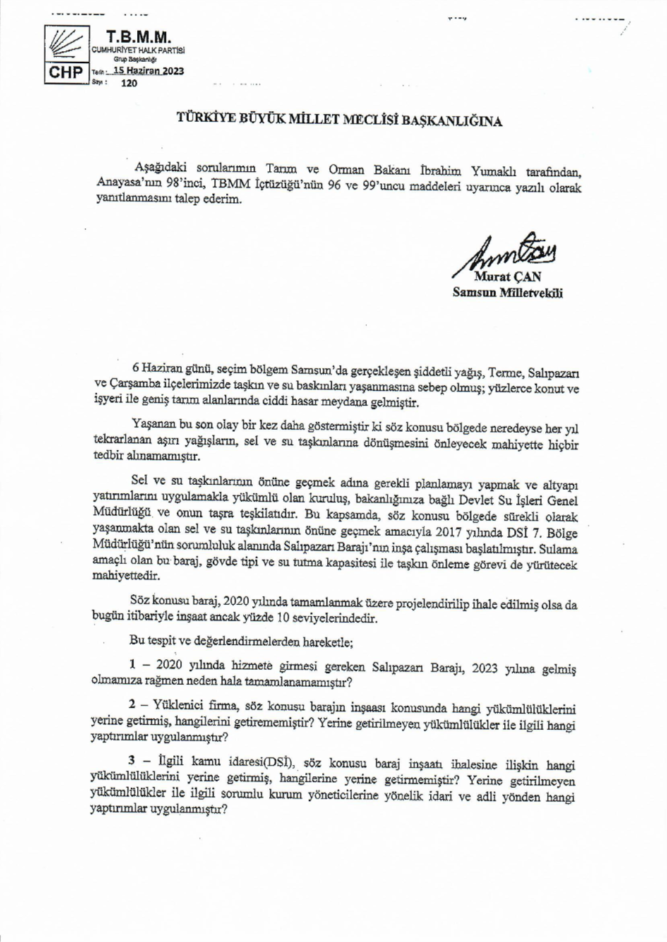 TBMM Genel Kurulu’nda yaptığı konuşmada, özellikle Salıpazarı, Terme ve Çarşamba’nın sel konusunda taşıdığı risklere işaret eden CHP’li Murat Çan, iktidar partisine “Salıpazarı Barajı’nı bitirmeniz için daha kaç sel yaşanması gerekiyor?” sorusunu yöneltti.