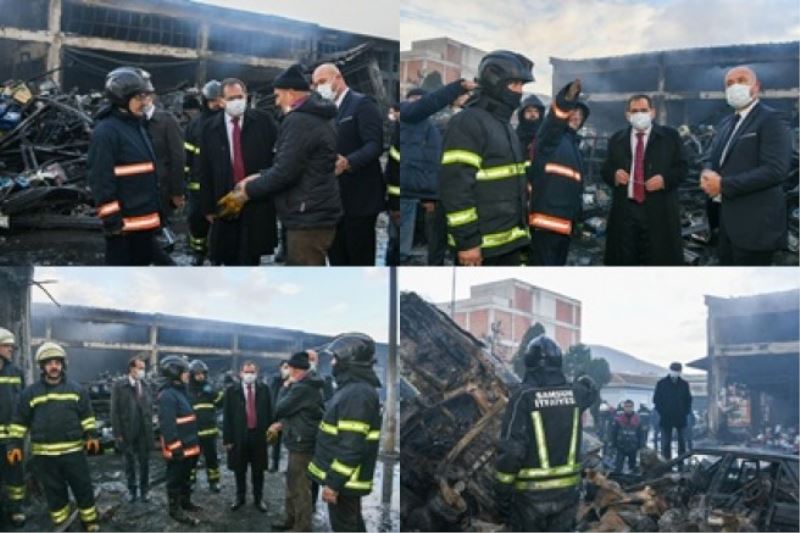 Samsun Büyükşehir Belediye Başkanı Mustafa Demir, bu sabah 19 Mayıs Sanayi Sitesi’nde meydana gelen ve birçok iş yerinin hasar gördüğü yangın bölgesinde incelemelerde bulundu. Yangını kontrol altına alan İtfaiye Daire Başkanlığı ek
