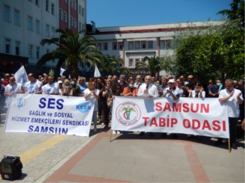 Samsun Tabip Odası başkanı yanındaki hekim meslektaşları ve sağlığın kaçınılmaz alternatif yardımcıları diğer sağlık emekçilerinin de katıldığı basın açıklamasında şunlar söylendi. “Aile Hekimleri Dernekleri Federasyonu – AHEF, Aile Hekimleri Sendikası – AHESEN, BİRLİK DAYANIŞMA SENDİKASI, GENEL SAĞLIK-İŞ SENDİKASI, HEKİM BİRLİĞİ SENDİKASI, HEKİMSEN, Kamu Diş Hekimleri Derneği – KADHED, Sağlık ve Sosyal Hizmet Emekçileri Sendikası – SES, TABİP-SEN, Türk Diş Hekimleri Birliği – TDB ve Türk Tabipleri Birliği - TTB adına yapılmaktadır, şeklinde ifadelerde bulundu. Bizler Emeğimizin Hakkını Aldığımız Sağlıklı bir Gelecek İçin G(ö)rev başındayız. Biz “ başka Kamil Furtun’lar Ersin Arslan’lar olmasın, yaşatmak için yaşamak istiyoruz” diyenler, Biz, gecesi gündüzü olmayanlar. Biz, hastalandıran bir sağlık sistemine göz yummayan, toplum sağlıksızken nefes alamayanlar, Biz, bu gördüğünüz binalarda sistemin tüm başarısızlığının altında bırakılanlar; Biz, aylardır oyalama taktikleri ile yok sayılan, emeği hiçleştirilen, mesleği değersizleştirilenler, Biz, KHK ve güvenlik soruşturmalarıyla, Aile hekimliği ceza yönetmeliğiyle baskı altına alınmaya çalışılanlar, Tüm bu olumsuzluklara rağmen; Biz “ giderlerse gitsinler”e boyun eğmeyenler; Mesleğinin beyazını karanlığa ışık yapanlar; mek bizim, söz bizim diyoruz. Uzun mesailerde, yorucu nöbetlerde, kışkırttığınız sağlık taleplerine yanıt vermeye çalışan emeğin sahibi olarak BİZLER, milyonlar; Yoksulluk sınırı altı ödemelere, Bizleri ölümüne çalıştıranlara, Sağlıkta şiddet üretenlere karşı sözümüz var diyoruz. Yeni yasa teklifiyle yeniden farkına vardığınız gibi Meclis’te, ekranlarda yürüttüğünüz senaryolarınız; hem bizlerin hem de toplumun gözünde artık hükümsüzdür. Aylar süren oyalamanın ardından, yeni yasa teklifiyle emeğimizle yeniden alay ettiniz. Bizler emekliliğe yansıyacak temel ücret artışı talep ederken, nitelikli şekilde ve baskı altında olmadan çalışabilmemiz için yeterli süre ve olanaklar, sağlıkta şiddetten arındırılmış çalışma alanları, toplumun daha az hastalanması için koruyucu sağlık hizmetlerinin güçlendirilmesini isterken; sizlerin bize reva gördüğü, yalı ödeme sistemini dayatmak, emeğimiz için ayrılması gereken bütçeyi Şehir hastanelerine kira ve hizmet bedeli olarak gömmek oldu. Sizin bizlere dayattığınız sağlıksızlığa karşı bizler; Bu gidişatı değiştirmek, sağlıklı bir gelecek kurmak için birlikteyiz. Bugünkü G(ö)REV eylemimiz son değil. BU bir itiraz !! Mecliste yürütülen senaryoyu reddediştir.