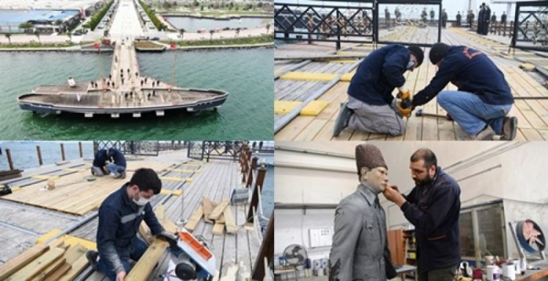 19 Mayıs 2008’de ziyarete açılarak turizme kazandırılan iskeleyi 13 yıl sonra yenileyen Büyükşehir Belediyesi, milli mücadelenin ilk adımlarını sembolize eden Gazi Mustafa Kemal Atatürk, silah arkadaşlarının balmumu heykelleri de onarıyor. Yerlerinden sökülerek Makine İkmal Daire Başkanlığı’ndaki sanat atölyesine götürülen heykeller, burada kapsamlı bakımdan geçiriliyor. Kırık, çatlak ve deforme olan kısımları onarılan heykellerin aksesuarları da yenileniyor.