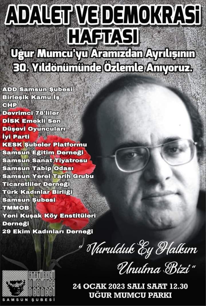 Uğur Mumcu aramızdan ayrılışının 30’ncu yıldönümünde Samsun’da anıldı. Adalet ve Demokrasi Haftası kapsamında İlkadım ilçesi Uğur Mumcu Parkı’nda anma etkinliği düzenlendi.