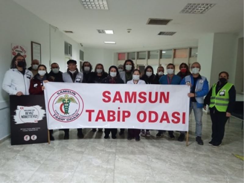 “COVID-19 pandemisi iki yılı dolduruyor. Türkiye salgının bedelini en ağır ödeyen ülkelerden biri. Vaka sayıları itibarıyla dünyada yedinci sırada yer alıyor. Ölüm sayıları resmi rakamlara göre dahi 85 bini geçti, gerçekçi tahminlere göre 250 bine yakın insanımızı kaybettik. Salgının baslarında üç̧ maskeyi dağıtmayı, aşıyı toplumla buluşturmayı yap(a)mayanlar; toplum sağlığı için gerekli önlemleri almayanlar, şimdilerde ise bütün önlemleri kaldırdılar. Hemen her şey salgın öncesine dönmüş̧ durumda. Sağlık Bakanı ise tüm sorumluluğu topluma yükledi, bütün bu yaşananların sorumlusu değilmiş̧ gibi sadece tweet atıyor. Pandeminin başından beri “SALGIN’ı değil “ALGI ”yı yönetmeyi tercih edenler hala “başarı hikayesi” anlatıyorlar. Oysa biz ölüyoruz. Eksik, yanlış̧, tutarsız politikalar, alınmayan önlemler, yerine getirilmeyen tedbirler yüzünden ölüyoruz! Karanlığa Karşı Önlüğümüzün Beyazına, Özlük Haklarımıza, Halkın Sağlık Hakkına Sahip Çıkıyoruz Türk Tabipleri Birliği ve Samsun Tabip Odası olarak Ekim ayından bu yana özlük haklarımız ve geleceğimiz için yeni bir eylem surecindeyiz. Beş̧ aydır haklarımız için sağlık kurumlarında ve alanlardayız. 23-27 Kasım tarihlerinde İstanbul’dan Ankara'ya “Beyaz Yürüyüş”te, 27 Kasım'da Ankara'da “Beyaz Forum”da taleplerimizi dile getirdik. Taleplerimizi karşılamasa, eşitsiz ve yetersiz de olsa hekimlerin ücretlerinde iyileştirme getiren bir teklif bütün siyasi partilerin desteğiyle Aralık ayı başında Meclis'ten geçti. Bizatihi Cumhurbaşkanı ve Sağlık Bakanı da kameraların önünde hekim ücretlerinin arttırılacağını açıkladılar” konuştular.
