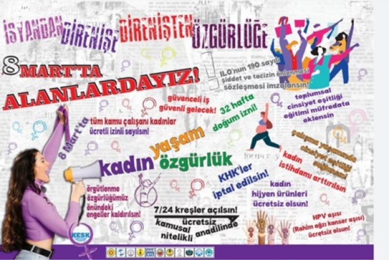 KESK Dönem Yürütmesi adına açıklamasını sürdüren Emine Uyarer, açıklamasını şöyle tamamladı. “Emperyalistlerin çıkar ve paylaşım kavgaları Rusya/Ukrayna üzerinden yürütülüyor. Afganistan, Irak, Suriye ve Kuzey Afrika'da yürütülen bölgeyi istikrarsızlaştıran ve halklar arası savaşa sürükleyen politikalardan en çok kadınlar etkileniyor. Savaşta canlarımızı kaybediyor, yerimizden yurdumuzdan ediliyor mültecileştiriliyoruz. Gittiğimiz ülkelerde ayrımcılığa uğruyor, ucuz iş gücü olarak görülüyoruz. Savaştan en çok etkilenenler olarak barışın kadınların sözünün etkin olmasıyla mümkün olacağını söyledik, bunun mücadelesini verdik, veriyoruz. Ataerkil ulus devletlerinize ve savaş sermayesini besleyen politikalarınıza karşı barış ısrarımızdan vazgeçmedik, vazgeçmeyeceğiz. Erkek aklının eseri olan savaşa karşı kadın eliyle barışı inşa etme mücadelemizi en zor şartlarda dahi yaptık, yapmaya devam edeceğiz. Biz kadınlar; hakkımız olanı ancak sokaklarda olarak; evde, işte, cezaevinde, okulda ve yaşadığımız her yerde mücadeleyi büyütürsek kazanacağımızı biliyoruz. Bu yüzden faşizmin, erkek egemenliğinin vücut bulmuş hali AKP/MHP iktidarına karşı tüm kadınları 'İsyandan direnişe, direnişten özgürlüğe' şiarıyla kadın örgütlüğünü büyütmeye davet ediyoruz. KESK'li kadınlar olarak bu 8 Mart'ta da kadın kazanımlarına dönük saldırılara, kadın yoksulluğuna, savaşa, kadın emeğinin görülmemesine, işyerlerimizde yaşadığımız ayrımcılığa, şiddete ve tacize karşı isyanımızı birleştirip, kadın buluşmaları ile direnişi örgütlemek için alanlarda, işyerlerinde olmaya devam edeceğiz” dedi.