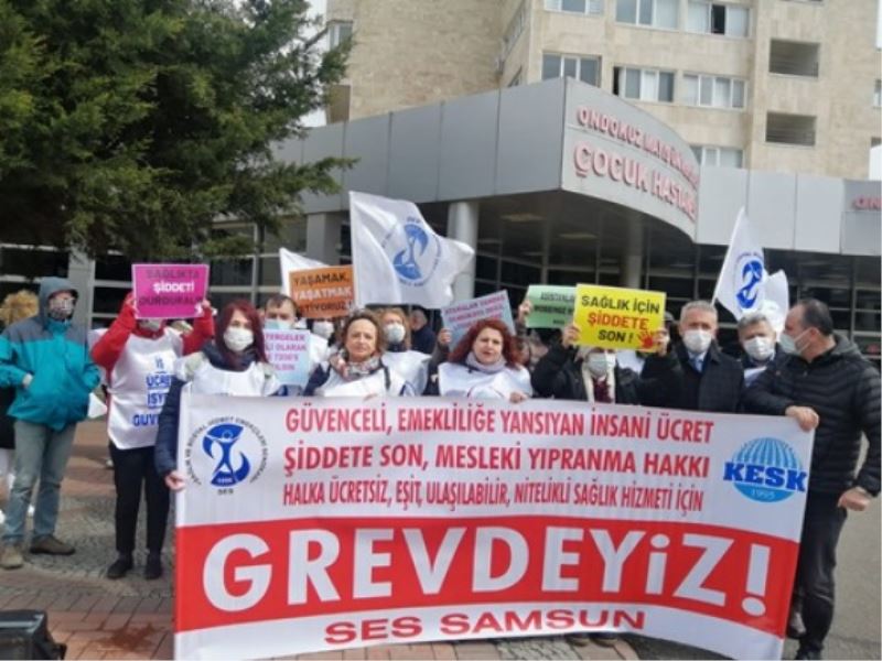 “Haklarımız Emeğimiz ve Sağlık Hakkımız için Sağlık ve Sosyal Hizmet Emekçileri olarak Üretimden Gelen Gücümüzle Mart Ayında Mücadeleyi Büyütüyor, Hiçbir yere Gitmiyoruz” diye ifadelerde bulunan SES Samsun Şube Başkanı Aysel Oc