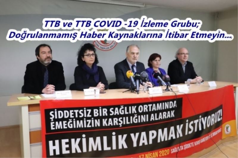 ürk Tabipleri Birliği Merkez Konseyi ve TTB COVID -19 İzleme Grubu açıklamasının sonunda şunları ifade etti. 'Yurttaşlarımıza çağrımız; panik yapmadan kişisel önlemlerini almaları ve bu konuda Sağlık Bakanlığı Bilim Kurulu, Birliğimiz tarafından kurulan ‘TTB Yeni Koronavirüs Hastalığı İzleme Grubu’nun önerilerini yakından izlemeleri; doğrulanmamış haber kaynaklarına itibar etmemeleridir.