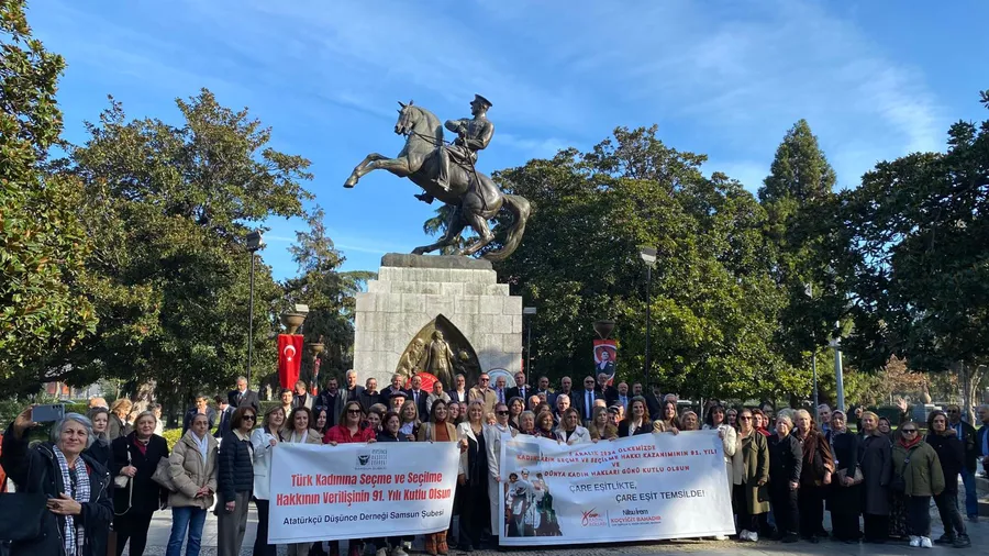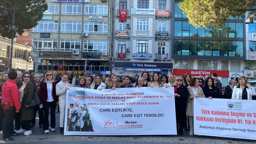 (SAMSUN)- 5 Aralık Dünya Kadın Hakları Günü dolayısıyla Samsun’dan güçlü bir eşitlik çağrısı yükseldi. CHP Samsun İl Kadın Kolları Başkanı Nilsu İrem Koçyiğit Bahadır, yayımladığı açıklamada kadınların siyasetteki temsiline ilişkin çarpıcı veriler paylaşırken, ardından Atatürk Anıtı önünde tiyatro sanatçısı Gülsen Kılınç, Türkiye’nin ilk kadın muhtarı Gül Esin’i canlandırdı.