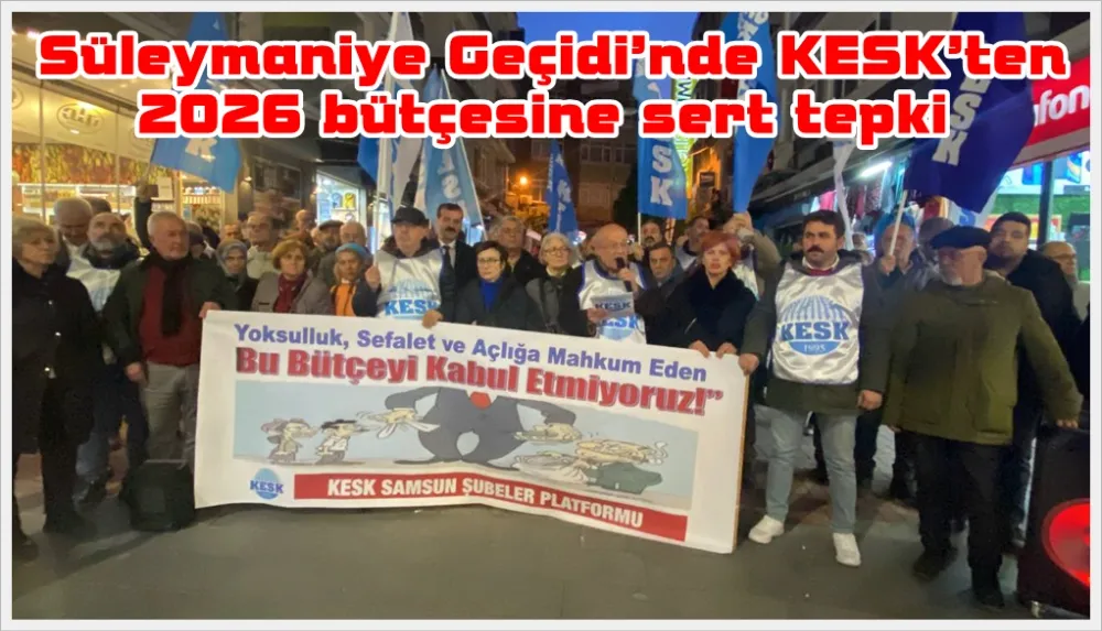 (SAMSUN) – KESK Samsun Şubeler Platformu, bugün saat 18.00’de mesai bitiminde Süleymaniye Geçidi’nde bir araya gelerek 2026 yılı bütçesine ilişkin basın açıklaması yaptı. Açıklamayı KESK Samsun Dönem Sözcüsü İsmail Yavuz okudu. Yavuz, Türkiye Büyük Millet Meclisi’nde günlerdir, aylardır 2026 bütçe yasa teklifinin görüşüldüğünü belirterek, bütçenin toplumun geniş kesimlerinin değil sermayenin çıkarlarını esas aldığını ifade etti. İsmail Yavuz, konuşmasında şunları söyledi: