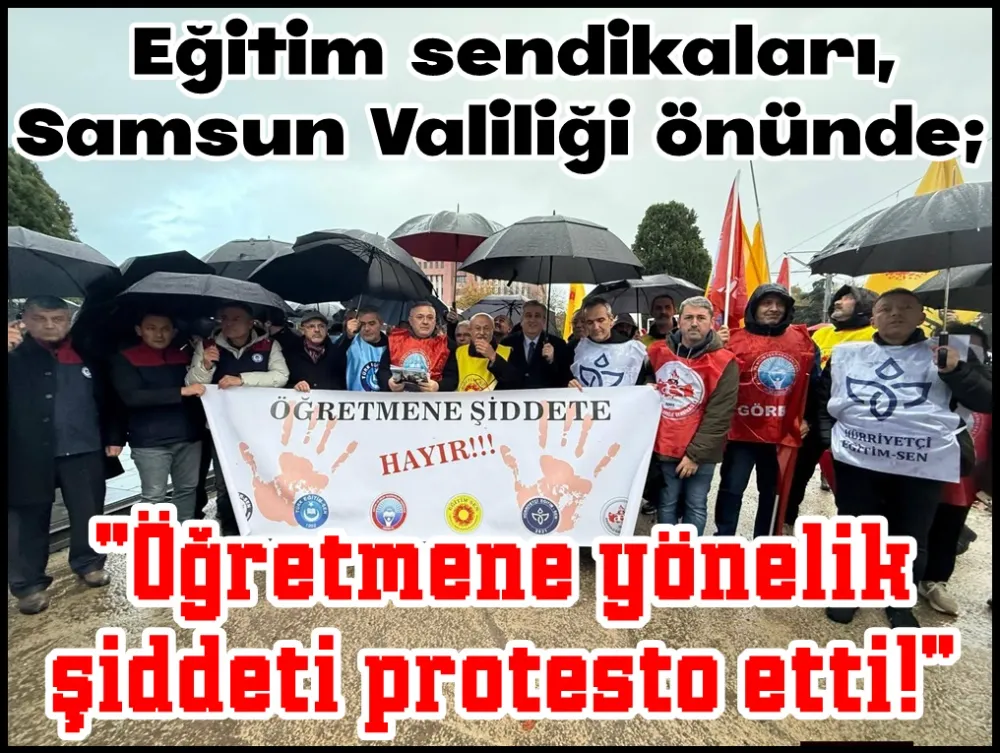 (SAMSUN) – Samsun’da şubeleri bulunan Eğitim-İş, Eğitim-Sen, Hürriyetçi Eğitim-Sen, Türk Eğitim-Sen, Eğitim Bir-Sen ve Anadolu Eğitim-Sen sendikalarının üye ve yönetim kurulları, sağanak yağmura inat Samsun Valiliği önünde bir araya gelerek “Öğretmene şiddete hayır, susmuyoruz, kabul etmiyoruz, boyun eğmiyoruz” başlıklı basın açıklaması düzenledi. Açıklamayı Eğitim-İş Samsun Şube Başkanı Onur Gündüz okudu.