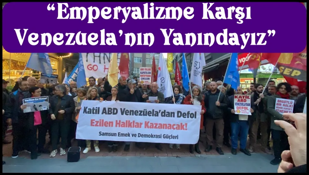 (SAMSUN)- Samsun’da emek ve demokrasi güçleri, ABD’nin Venezuela’ya yönelik askeri müdahalesini protesto ederek NATO’dan çıkılması ve askeri üslerin kapatılması çağrısı yaptı. Samsun’da emek ve demokrasi güçleri, ABD’nin Venezuela’ya yönelik askeri müdahalesini protesto etti. Yapılan basın açıklamasında, ABD’nin uluslararası hukuku hiçe sayarak bağımsız bir ülkeye saldırdığı belirtilerek, müdahalenin gerçek nedeninin Venezuela’nın petrolü ve yeraltı kaynakları olduğu vurgulandı.
